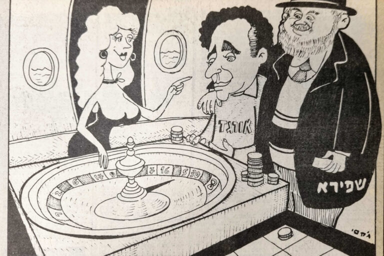בית ספר למתאבדים (טרוריסטים איסלמיסטים) איור + טקסט פוליטי של ג'קסי ג'קסון בשבועון לאישה, למדור סאטירי בשם 'צב השעה' (בשנות ה-80)