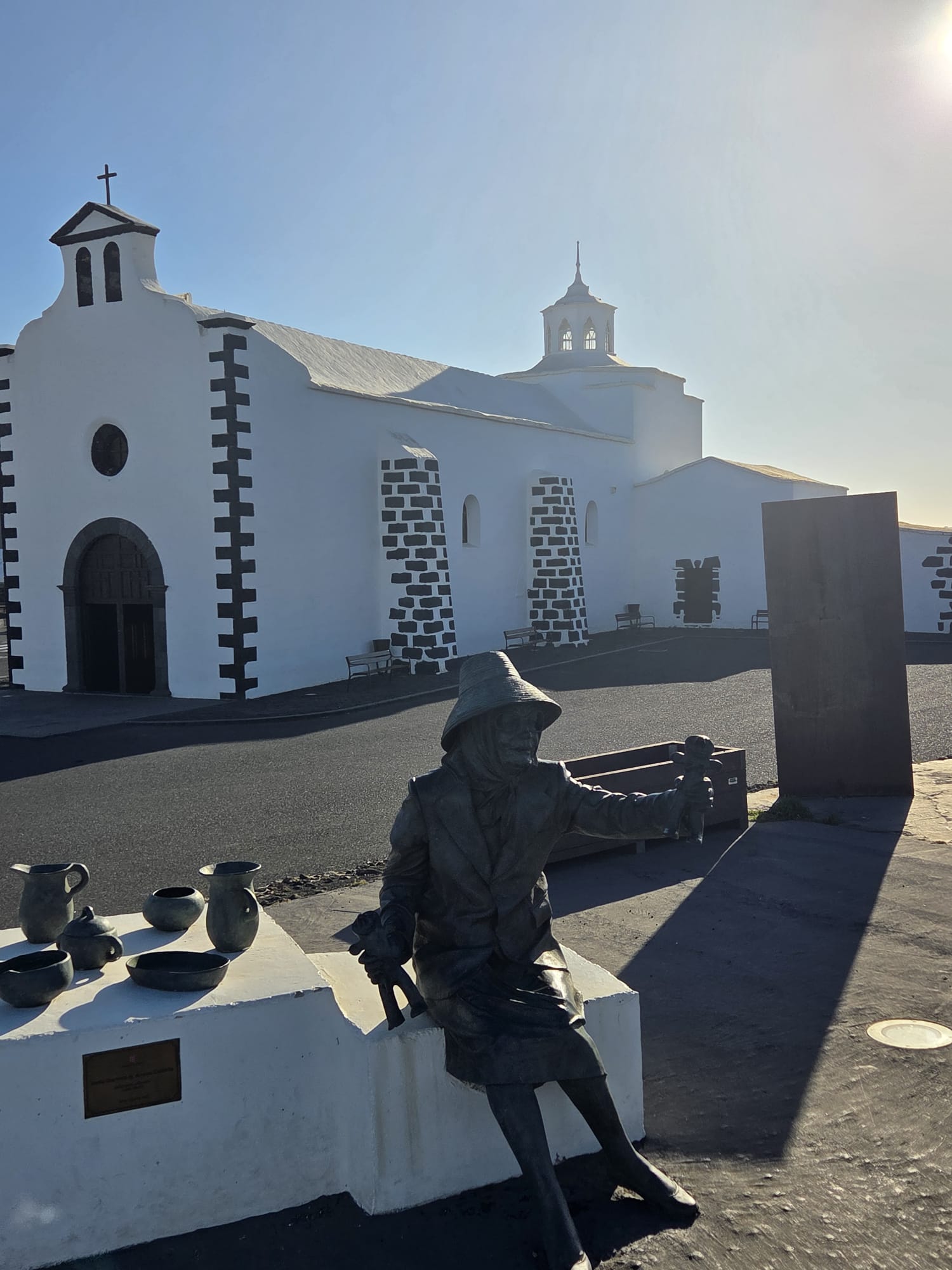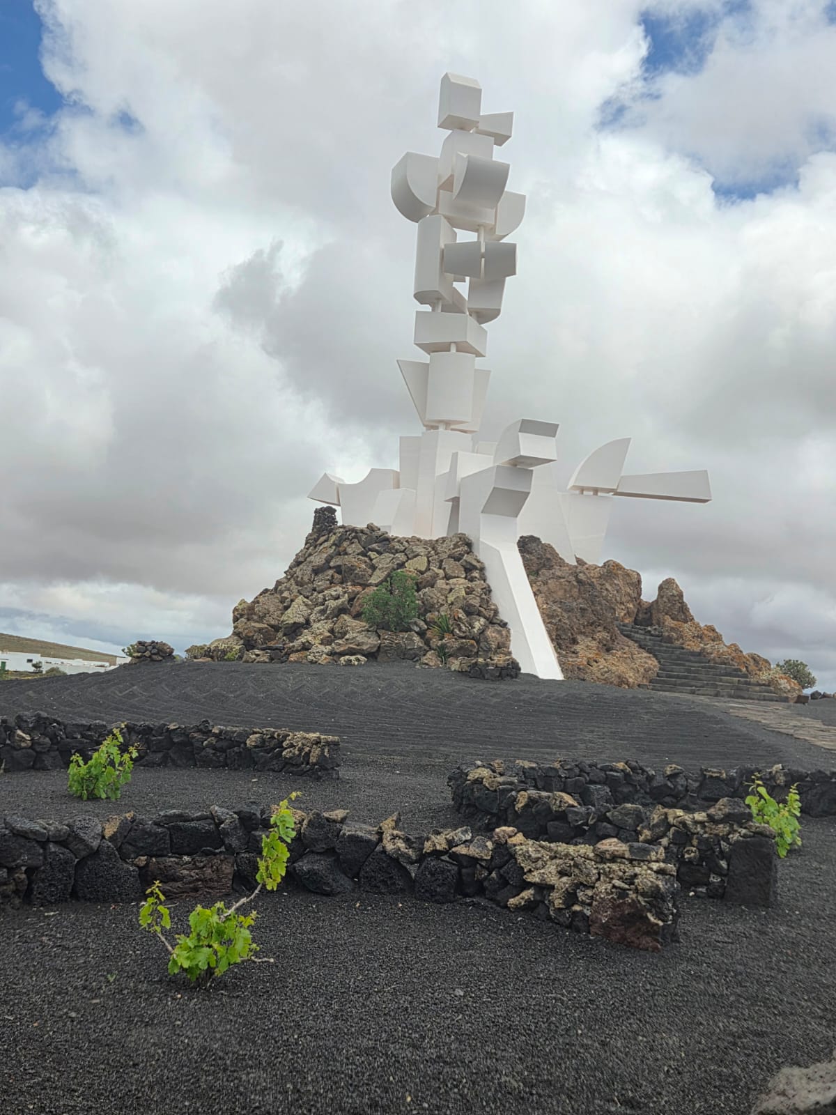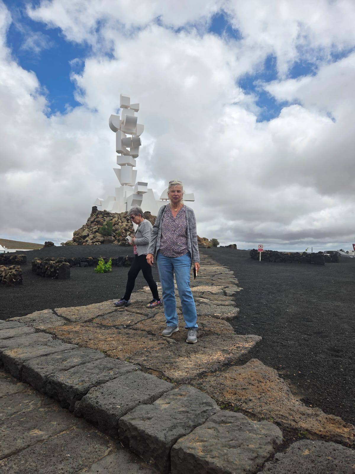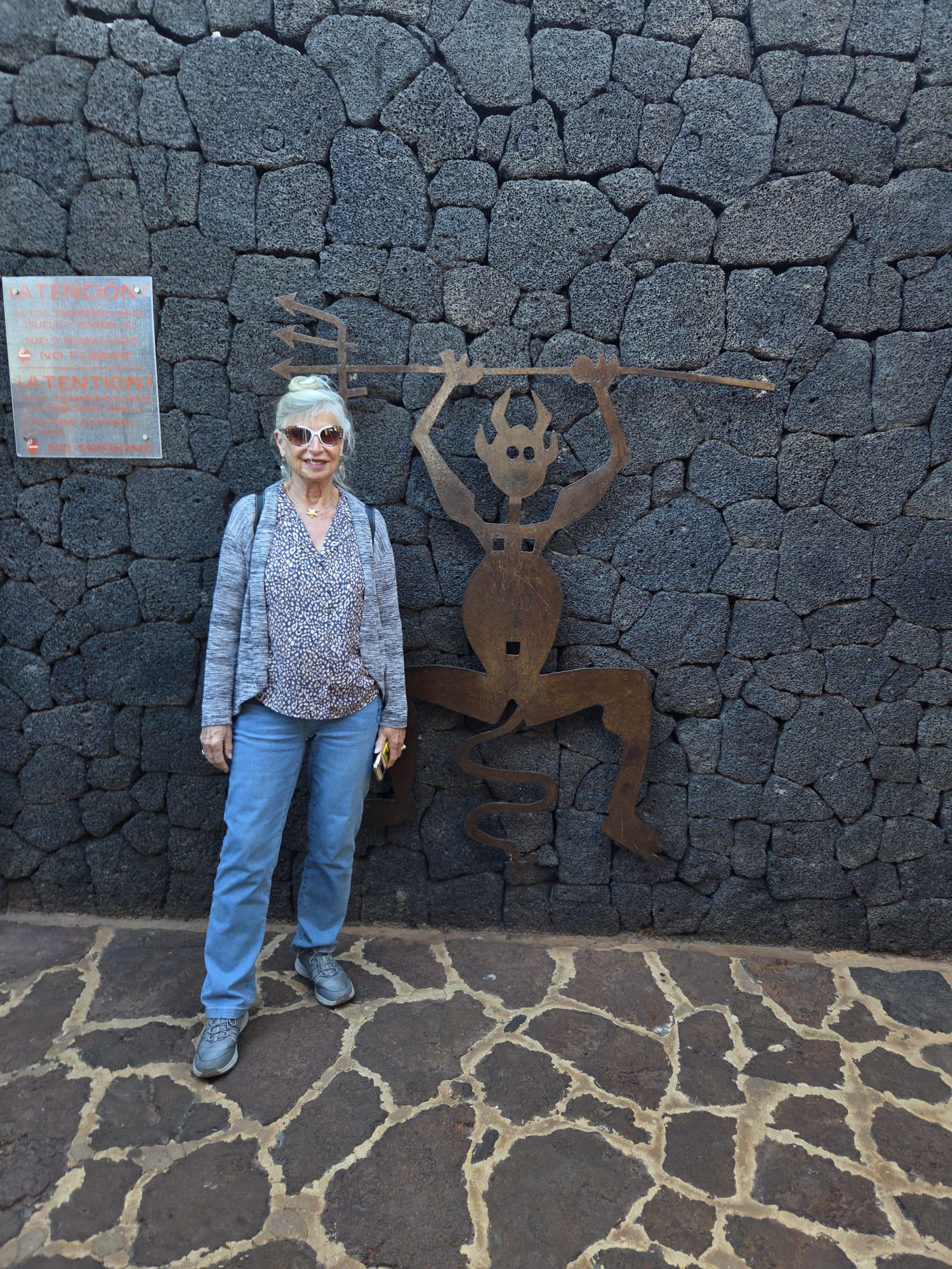 צביה על רקע האנדרטה של האמן שהמציא את האי לנסרוט לתיירות העולמית על מופעי הלבה הייחודיים שלה