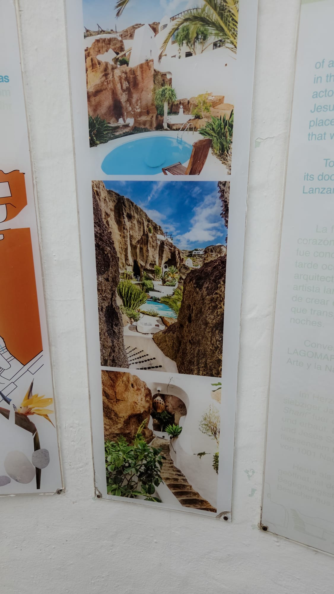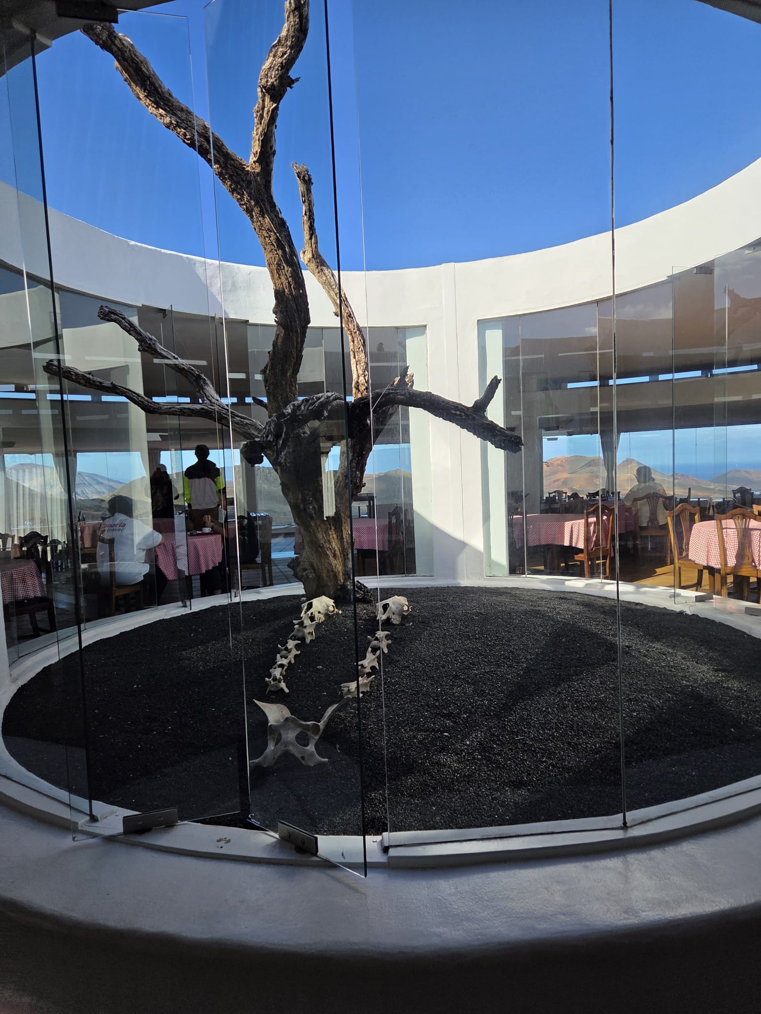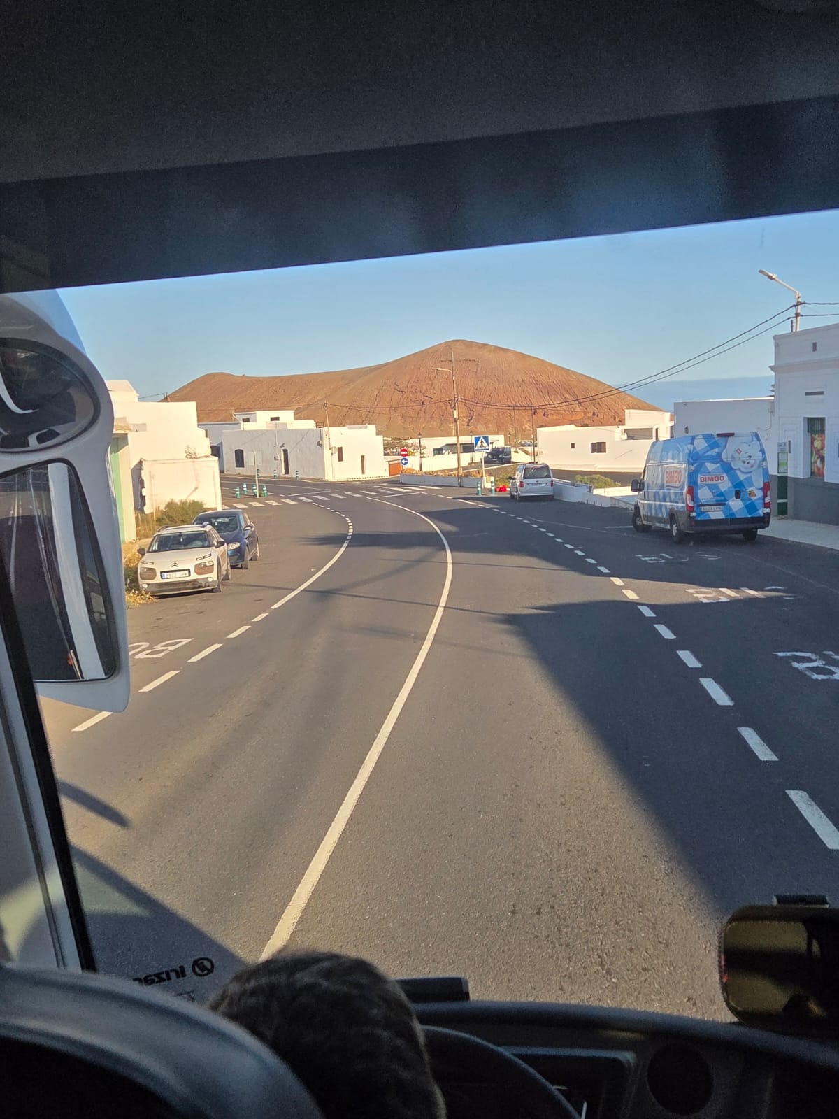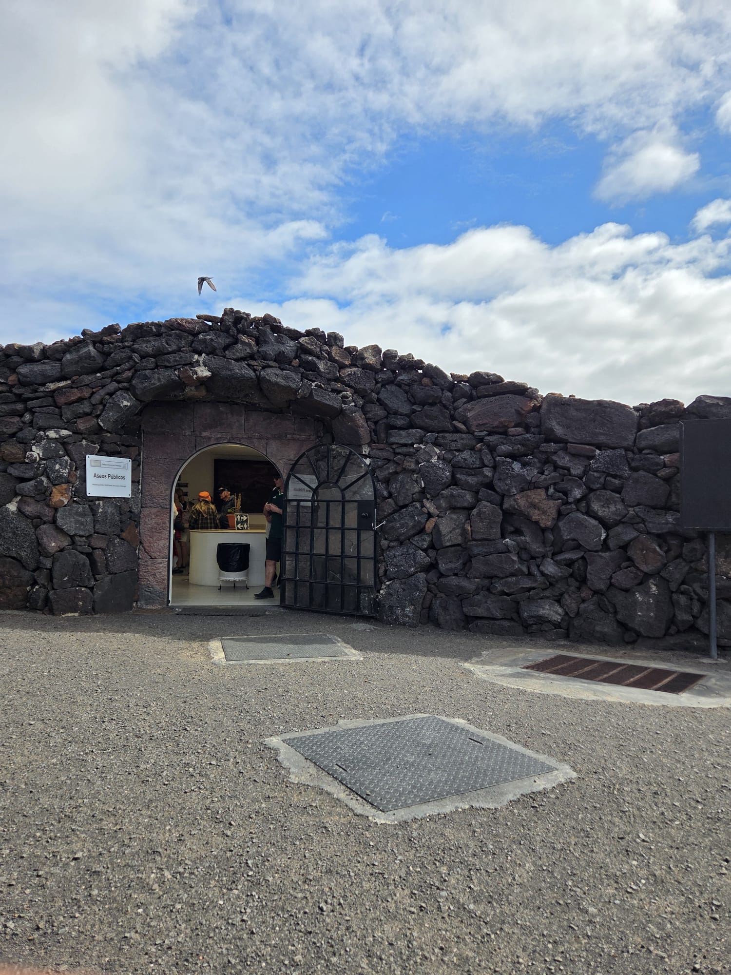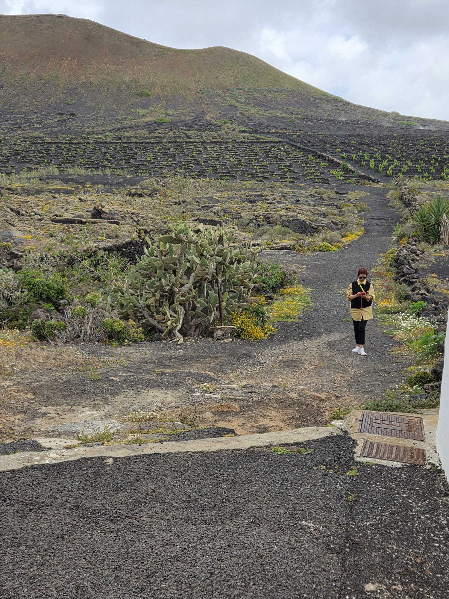 צביה על רקע האנדרטה של האמן שהמציא את האי לנסרוט לתיירות העולמית על מופעי הלבה הייחודיים שלה