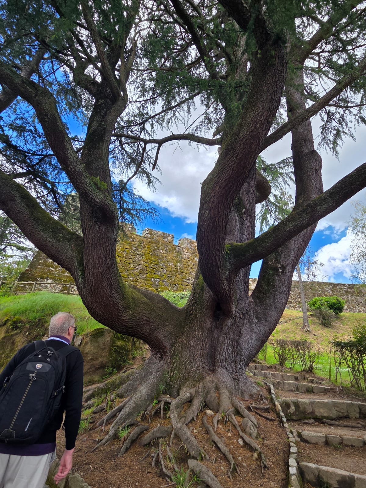 עץ בן מאות שנים במעלה המצודה שנבנתה להגן על באיונה